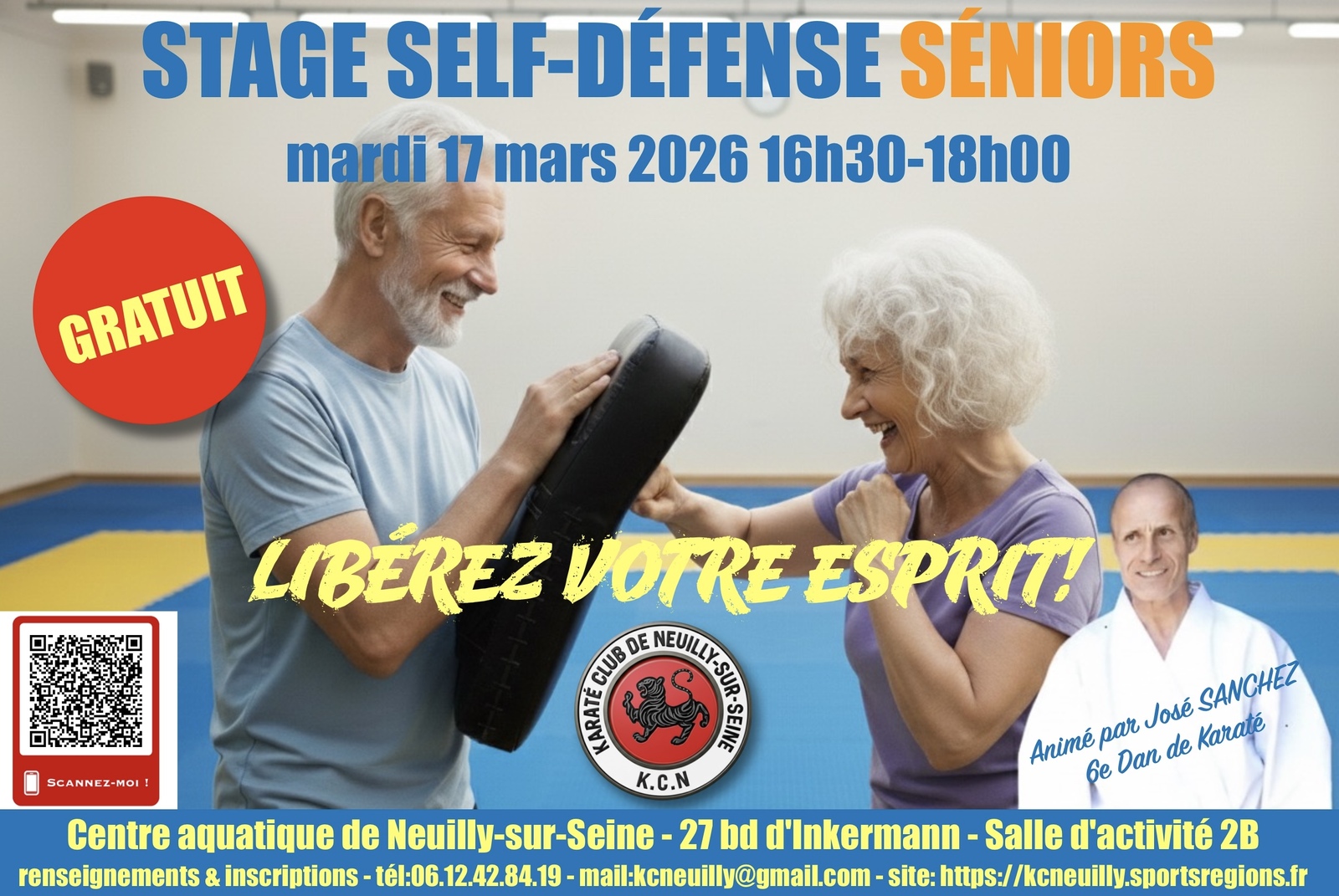Saviez-vous que la self-défense est un excellent moyen pour les seniors d'entretenir leur santé physique et mentale ? Le Karaté Club de Neuilly-sur-Seine, fondé par le Dr. Thierry Bouillet, cancérologue des hôpitaux, et président de la CAMI fédération nationale sport & cancer est fier d'organiser un stage près de chez vous, spécialement conçu pour les plus de 60 ans, sportifs ou non. Apprenez à mieux vous positionner, à réagir calmement et à gagner en sérénité dans toutes les situation tout en entretenant votre santé. C'est plus que du sport : c'est une approche pour vivre plus sereinement.